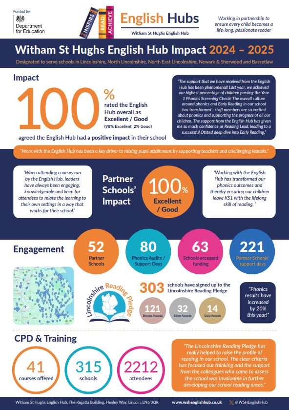 Witham St Hughs English Hub is one of 34 English Hubs that were selected for our expertise in teaching reading and to support schools in our surrounding area. Our role is to support schools to develop the DfE’s three main aims, with a particular focus on the first 20% and to ensure that every child becomes a successful reader, regardless of their background, needs or abilities.